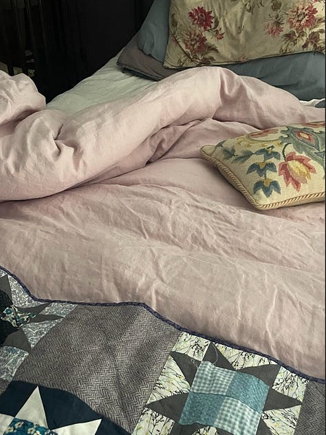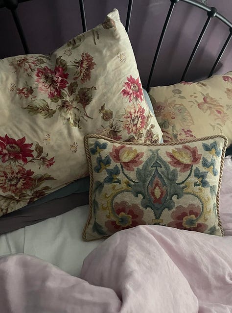 My bed is huge, and it is the dominating feature of the room, which doesn’t have any large pieces of furniture like a wardrobe in it (there’s nowhere to put one, because of the vagaries of an attic ceiling), and I don’t ever work from home in bed - even during lockdown I would always take myself to a table to work. Every so often, maybe once every couple of months, I’ll sleep badly: I’ll wake in the small hours and not go back to sleep. But as a rule, I sleep like a log for seven hours every night. I have a bath with mu waterproof kindle and a cup of peppermint tea, then I go to bed and keep reading, and go out like a light. I’ve been known to wake up in the morning with my face pressed to my kindle, or just toppled over from the upright position I was in before I fell asleep. I think my evening wind-down ritual helps, but I also think making sure that nothing work-related impinges on the place where I rest helps. I wish I could say that my bedroom was a tech-free sanctuary but of course it isn’t: I check my emails and messages, I write this newsletter, I read substack tucked up in bed with my morning tea and coffee. I’m more than capable of conducting Sundays from bed, just getting up for more refreshments, to cook or to do laundry.