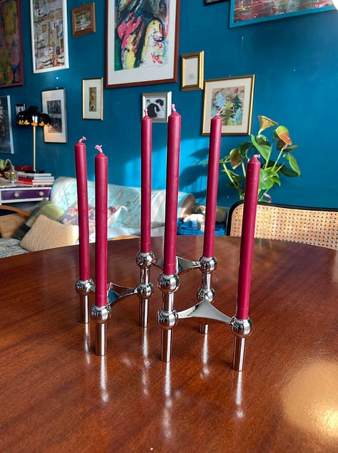 A couple of weeks ago, I put a runner down in the hallway. It’s a wool one from IKEA that is not on the website, that I saw months ago, decided I couldn’t afford and then couldn’t stop thinking about. Even if it’s cold and wet and I forgot to set the heating to go on, just opening the door and seeing that rug lifts my spirits. The flicker of a candle, that tiny flame, gives an illusion of warmth, and I love the ritual of lighting and extinguishing a candle. For Christmas this year I asked for the Stoff Nagel candle holders: I have been stalking them for a very long time, because I think they are beautiful, and I love the idea that you can add to them over the years - and I also am very drawn to a more modern take on the traditional silver candelabra.
