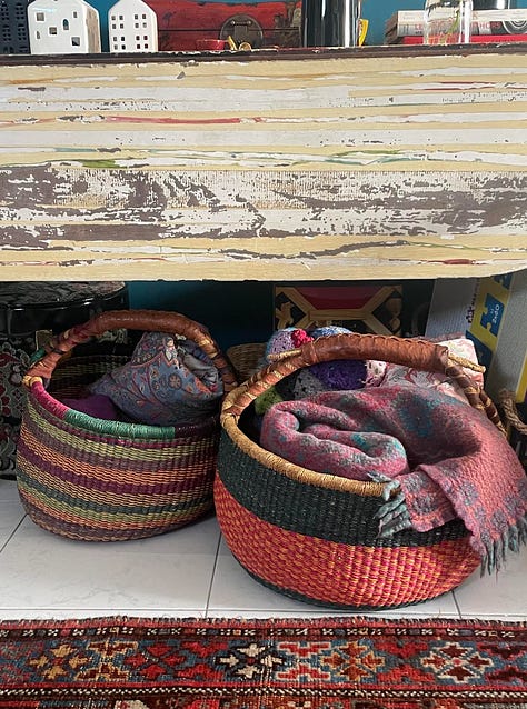 Our family homes, by which I mean the ones I grew up in, as well as those belonging to my daughter, sister, niece, are characterised by being welcoming. When you come into our living rooms, you have somewhere to sit and put your feet up, and somewhere to put your drink. You have shelves of books to look at, and every wall is a gallery wall, laden with original art, prints, postcards, plates, bits of textile art. If you get cold there are throws (some hand made) to wrap around you, and cushions (also some hand made) to admire and adjust behind you.
